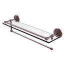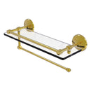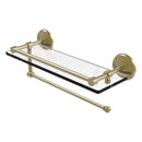 Maximize space and efficiency with this beautiful glass shelf and paper towel holder combination. Gallery rail will keep your items secure while the integrated paper towel holder provides a creative space for your roll. Made of solid brass and tempered