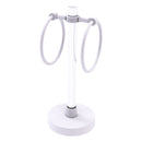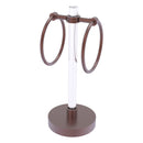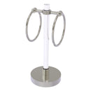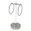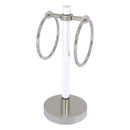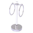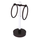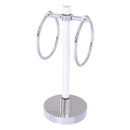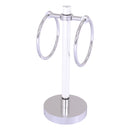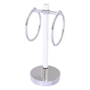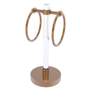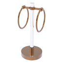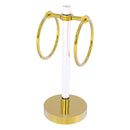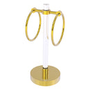 This elegant vanity top guest towel valet will add style and convenience to your bathroom décor. Guest towel valet has two rings to keep your towels within reach of the sink where they are needed. Accessory includes bold use of clear acrylic to create an almost hypnotic look against the brass construction. Guest towel stand is ideally sized for hand towels and washcloths. Heavy base will help prevent stand from tipping.